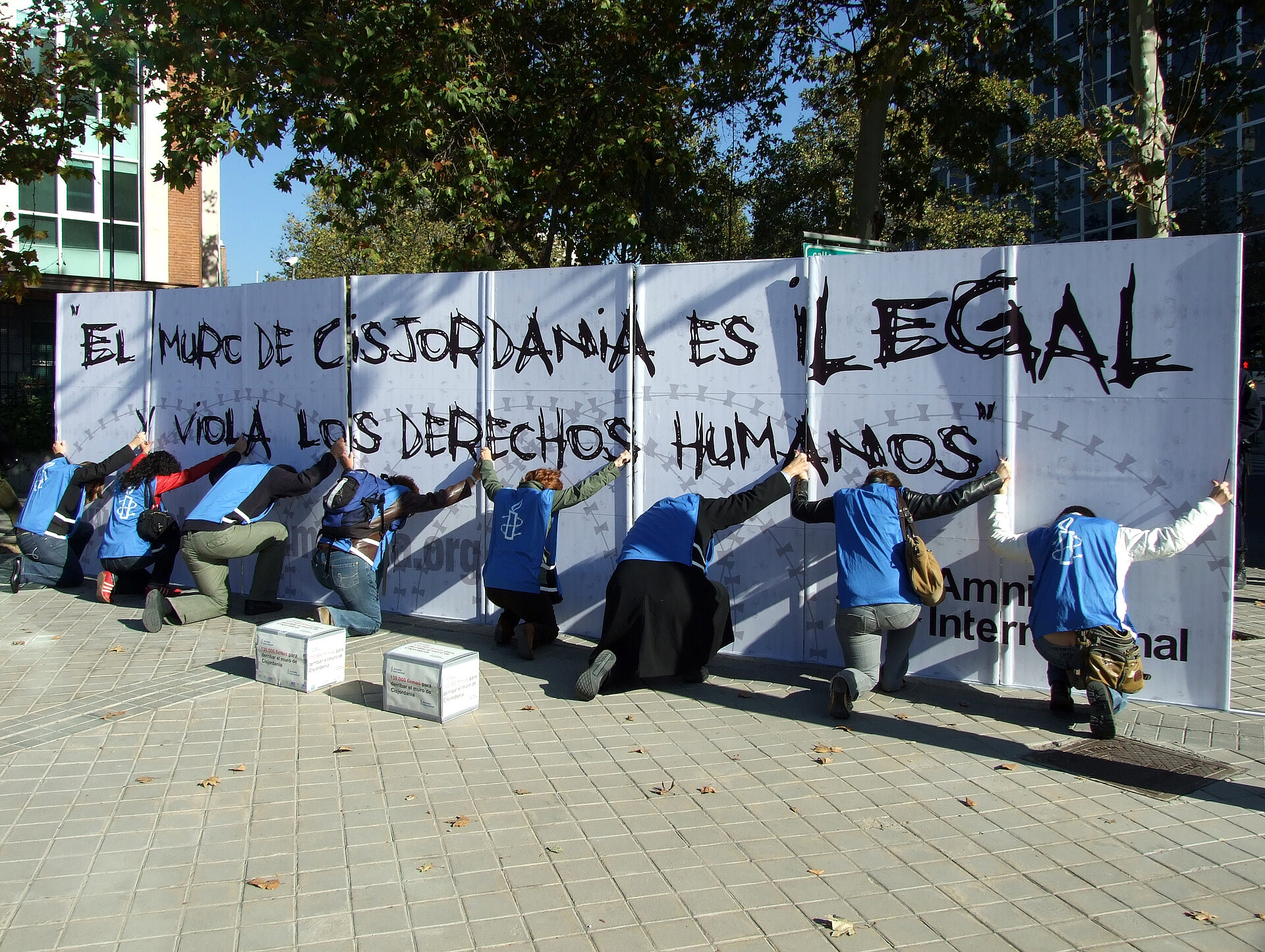 Durante el acto de entrega, activistas de la organización han realizado una performance en la calle desplegando una gran pancarta simulando un muro con los lemas “El muro de Cisjordania es ilegal y viola los derechos humanos” y “más de 130.000 personas piden a Israel que derribe el muro de la injusticia”.