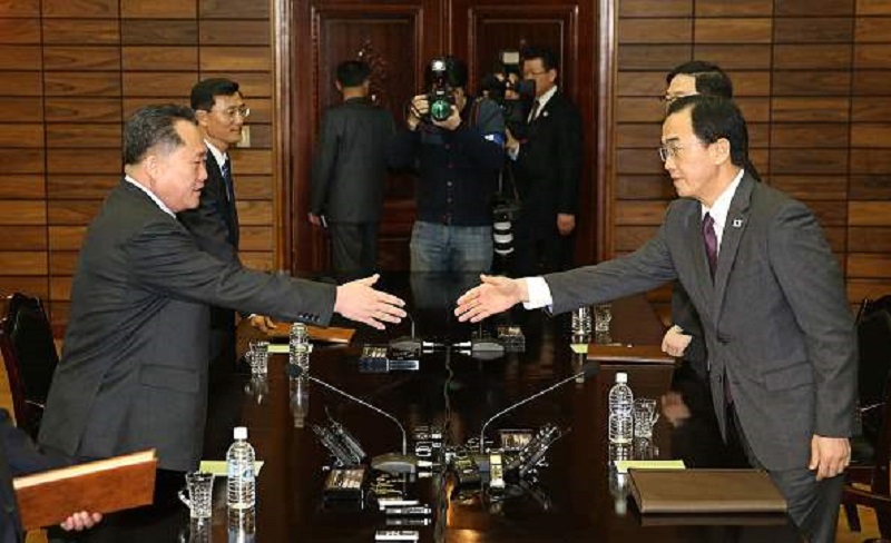 El ministro de Unificación de Corea del Sur, Cho Myoung-Gyon, estrecha la mano del jefe de la delegación de Corea del Norte, Ri Son-Gwon, el 29 de marzo.