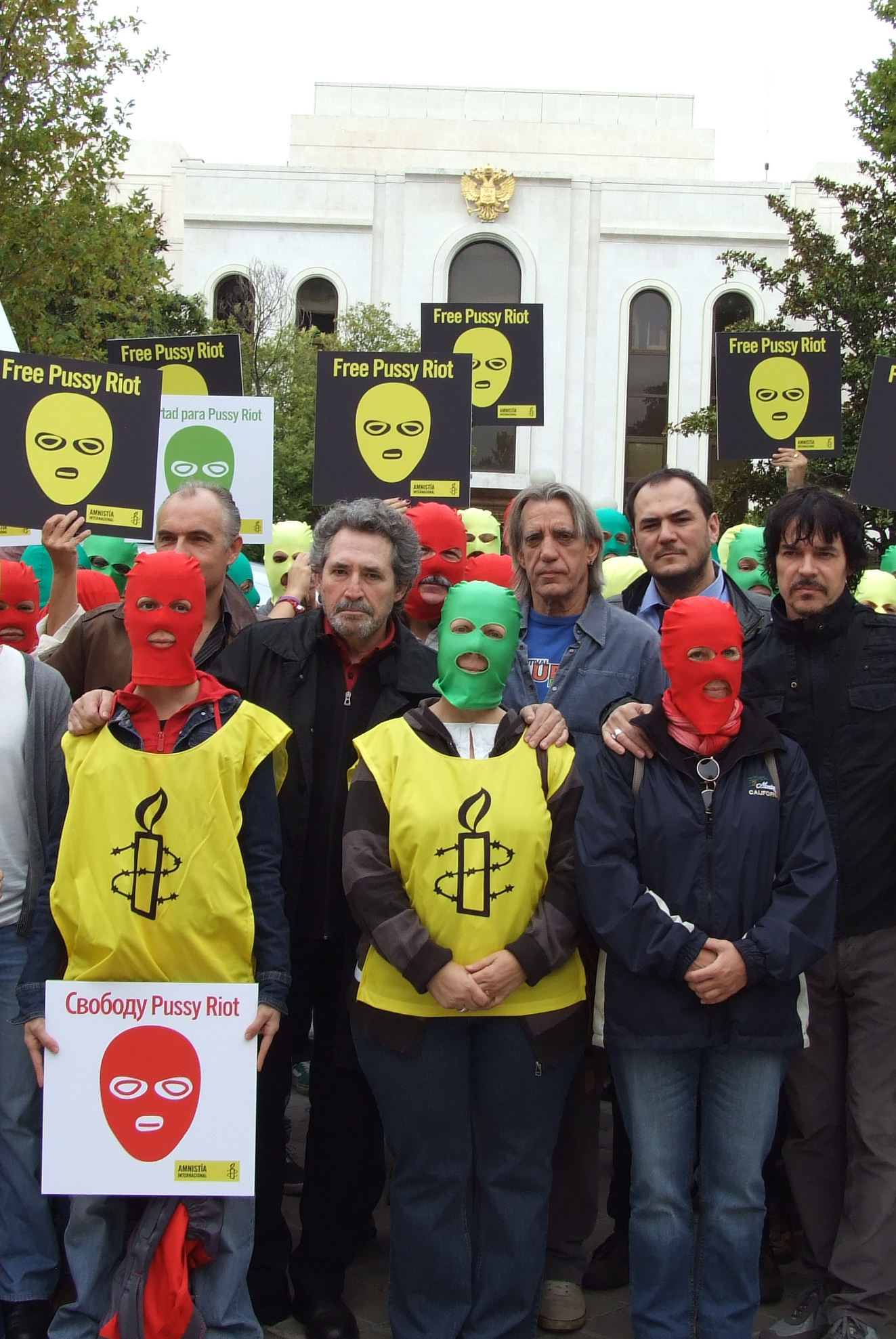 Representantes de Amnistía Internacional España se reunieron ayer con la Embajada de la Federación Rusa e hicieron entrega de más de 38.000 firmas que pedían la liberación de las cantantes. La organización valora positivamente el compromiso de la administración rusa para seguir dialogando con AI, pero muestra su preocupación por la falta de reconocimiento por parte de ésta, de que la libertad de expresión está en peligro en Rusia. Free Pussy Riot La imagen de las integrantes de Pussy Riot con capuchas de colores se ha convertido en un símbolo de la libertad de expresión en el mundo. Amnistía Internacional ha reunido hoy frente a la Embajada de Rusia en Madrid a cerca de 100 activistas y simpatizantes de la organización con capuchas de colores para pedir su liberación.